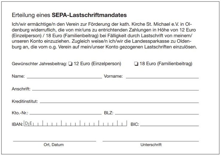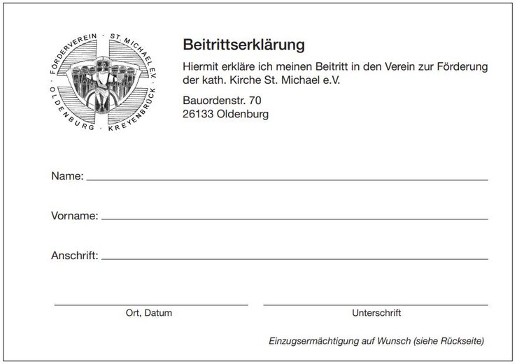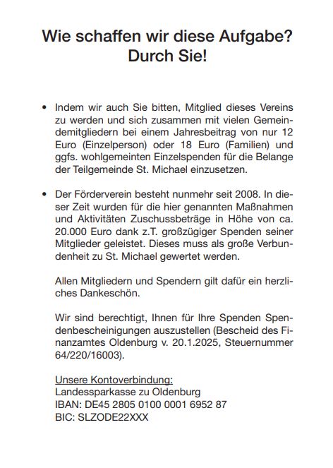 Werden auch Sie Mitglied im Verein (Jahresbeitrag 12 €) oder lassen Sie uns eine Spende zukommen. So unterstützen Sie direkt die Erhaltung der Gebäude in St. Michael und die Gemeindeaktivitäten.