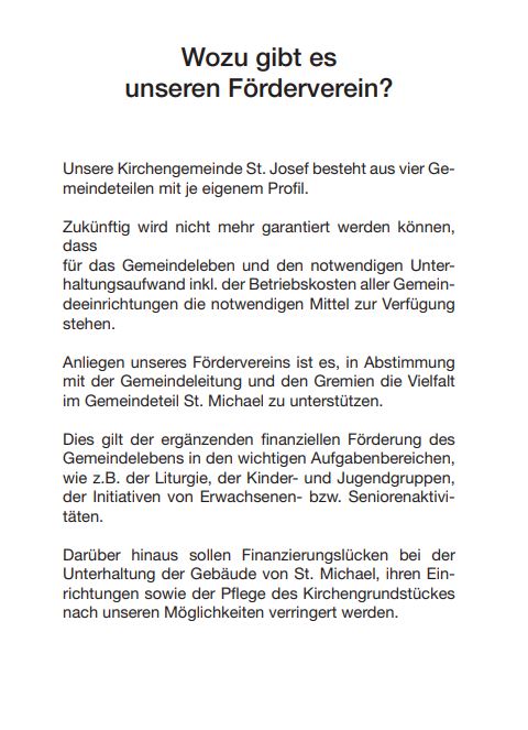 Unsere Kirchengemeinde St. Josef besteht aus vier Gemeindeteilen mit je eigenem Profil. St. Michael ist eine dieser vier Gemeindeteile, und um die Mittel für das Gemeindeleben und nötige Renovierungen bereitzustellen gründete sich der Verein zur Förderung der kath. Kirche St. Michael e.V..