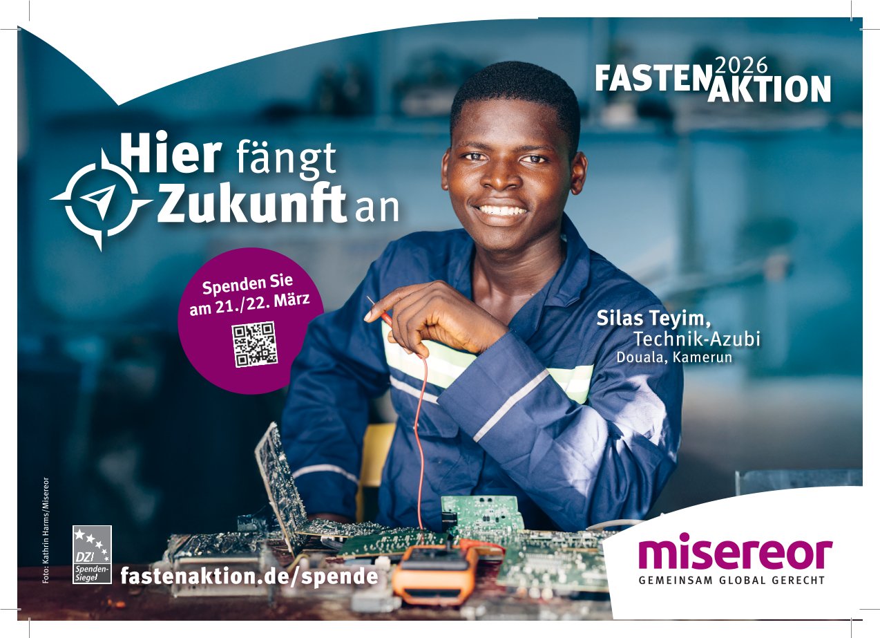 die Misereor-Fastenaktion 2026 steht unter dem Leitwort „Hier fängt Zukunft an!“. Es geht um die berufliche Ausbildung junger Menschen in den Entwicklungsländern. Sie sollen das Rüstzeug erhalten, um Zugang zum Arbeitsmarkt zu finden und somit den eigenen Lebensunterhalt bestreiten zu können. Berufliche Bildung hilft, der vielerorts verbreiteten Jugendarbeitslosigkeit zu entkommen. Aber sie ist weit mehr: Bildung ist Ausdruck von Würde, Teilhabe und Hoffnung. Sie stärkt die Jugendlichen darin, ihre Zukunft selbst zu gestalten – trotz aller Hindernisse und Schwierigkeiten. Sie verändert das Leben grundlegend. Misereor fördert unzählige Projekte in diesem Bereich. Denn oft ist es die berufliche Bildung, mit der Zukunft anfängt. Wir bitten Sie: Unterstützen Sie Misereor mit einer großherzigen Spende bei der Kollekte zur Fastenaktion am kommenden Sonntag. Haben Sie herzlichen Dank! Kollektenankündigung am 5. Fastensonntag 2026, dem 22. März 2026 Die Kollekte ist für Misereor bestimmt und dient der Förderung von Entwicklungsprojekten weltweit. In diesem Jahr stellt Misereor die Berufsausbildung in den Vordergrund, die jungen Menschen in schwierigsten Lebensumständen eine Zukunft eröffnet. Unterstützen Sie diese Bemühungen mit Ihrem Beitrag zur Kollekte.